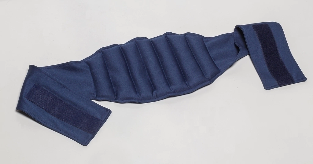 Almofada térmica flexível e anatômica com velcro para fixação na cintura.